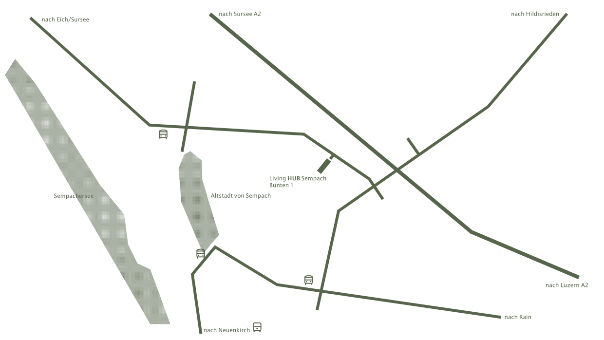 Ideale Verkehrslage mit dem direkten Autobahnanschluss A2 sowie den Anbindungen ans öffentliche Netz (diverse Bushaltestellen und SBB-Bahnhof Sempach Station).